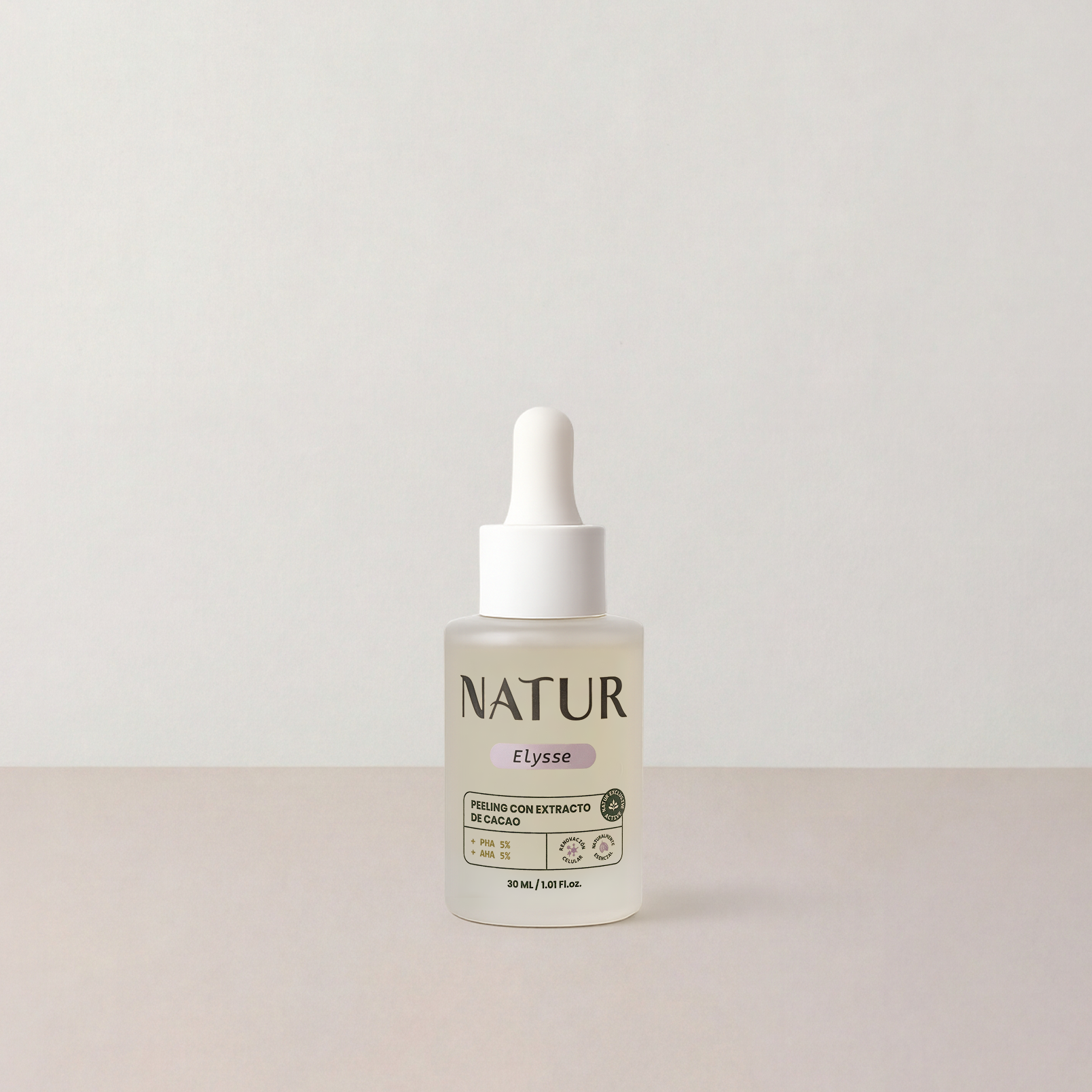 Elysse va con precisión de cirujano y suavidad de caricia: gluconolactona y ácido láctico disuelven lo muerto con eficacia amable, mientras nuestro extracto de cacao e inulina prebiótica protegen lo vivo—tu barrera y microbiota. Renovación sin cortar por lo sano.